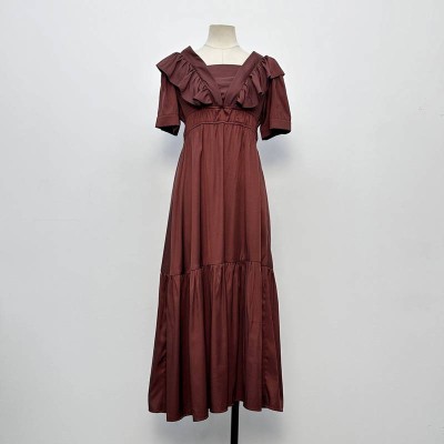 Wine Red Ruffle V-neck Waist-cinching Long Dress