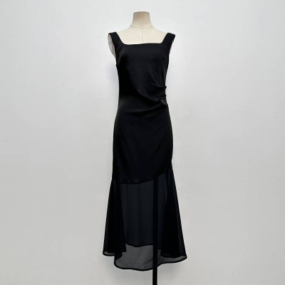 Black Square Neck Pleated Patchwork Mesh Slip Maxi Dress