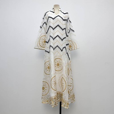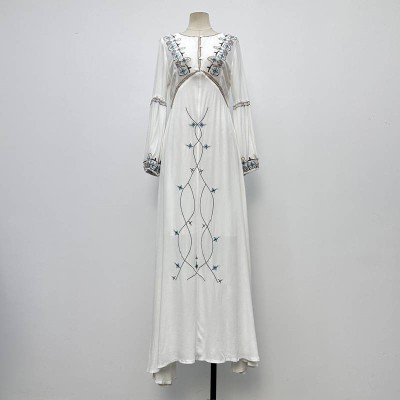 Ethnic Style Embroidered Long Sleeve White Maxi Dress Loose Slim Long Dress
