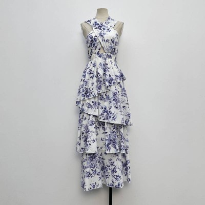Vintage Blue and White Floral Halter Hollow-out Tiered Maxi Dress Elegant Vacation Style Dress