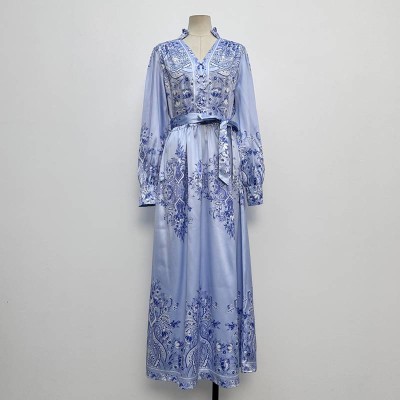 Blue and White Porcelain Style Printed V-neck Long Sleeve Belted Satin Maxi Dress, Elegant Waist-cinching Dress