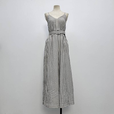 Simple Vertical Striped Waist Cinched Spaghetti Strap Maxi Dress
