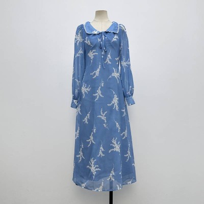 Blue Floral Peter Pan Collar Tie Chiffon Long-sleeve Maxi Dress Gentle Temperament Dress