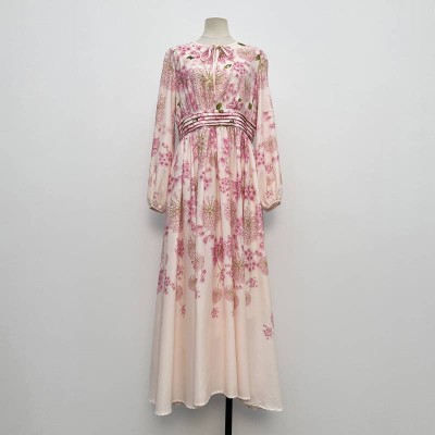 Pink Floral Print Tie Neck Waist Long Sleeve Long Chiffon Dress