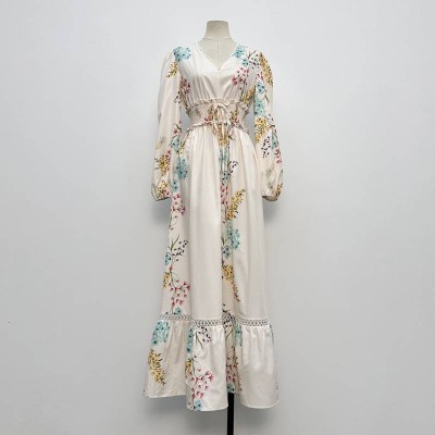 Vintage Floral V-neck Waist-cinched Long-sleeve Maxi Dress, Elegant Loose Dress