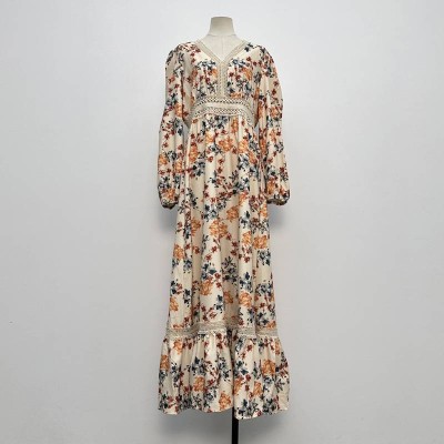 Vintage Floral V-neck Long Sleeve Lace Patchwork Maxi Dress