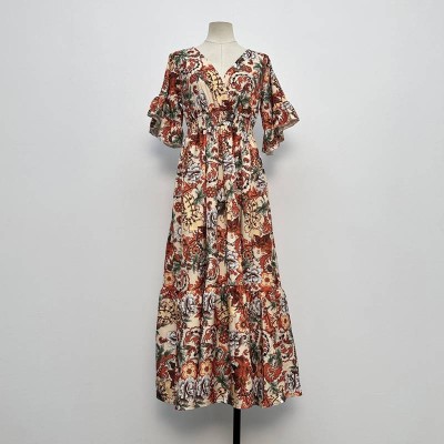 Vintage Print V-neck Ruffled Sleeve Waist Cinched Maxi Dress