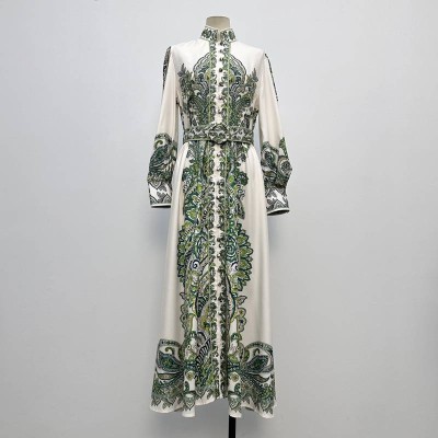 Vintage Paisley Print Stand Collar Long Sleeve Waist-Tie Maxi Dress