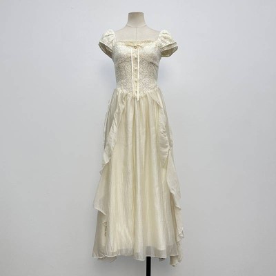 French Square Neck Jacquard Patchwork Maxi Dress Elegant Puff Sleeve Lace-up Dress