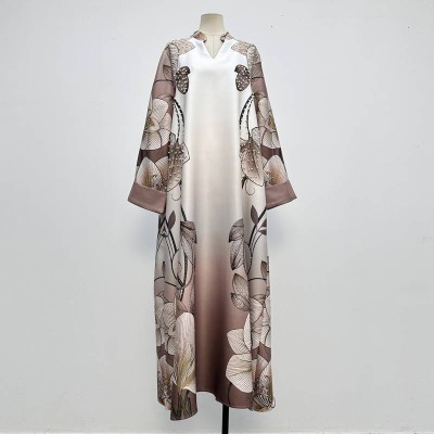 V-neck Long Dress with Vintage Floral Print, Loose Elegant Robe Dress
