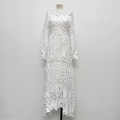 Elegant White Lace Stand Collar Long Sleeve Waist-cinching Maxi Dress Hollow-out Banquet Gown Dress