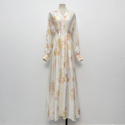 Elegant Printed Stand Collar Long Sleeve Long Shirt Dress Gentle Style Flowy Chiffon Maxi Dress