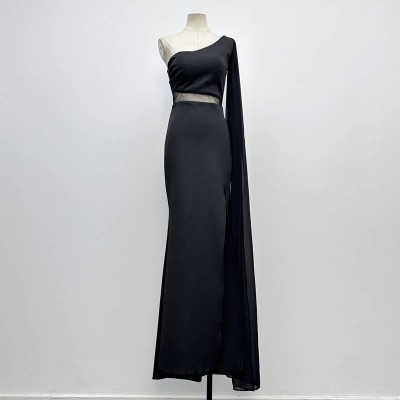 Black One-Shoulder Mesh Waist Slit Long Evening Dress Slim Banquet Party Gown