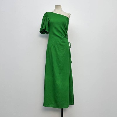 Fashion One-Shoulder Ruched Green Midi Dress Elegant Off-Shoulder Slim Fit Dress
