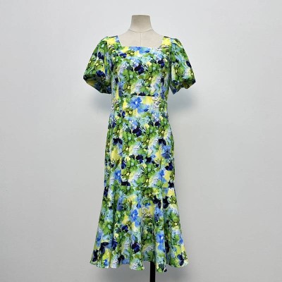 Floral Print Square Neck Puff Sleeve Midi Dress French Retro Vacation Style Waisted Fishtail Dress