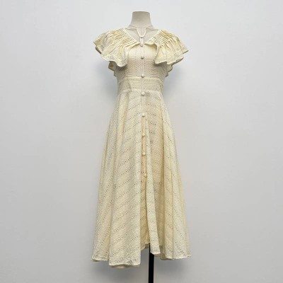 Beige Hollow-out Ruffled V-neck Waist-cinched Midi Dress
