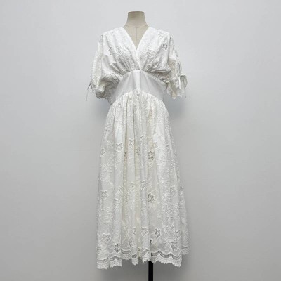 French V-neck Waist Cinched Embroidered Hollow-out Dress Elegant White Mid-length Tea Dress