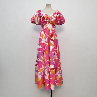 French Floral V-neck Waist-cinched Chiffon Midi Dress Slimming Elegant Vacation Long Dress