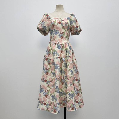 Jacquard Square Neck Puff Sleeve Midi Dress