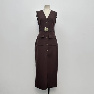 Vintage V-neck Sleeveless Waist-cinching Midi Dress Button Design Commuter Elegant Dress