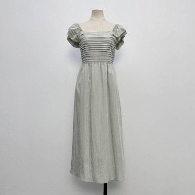 Light Grey Square Neck Pleated Short-sleeve Midi Dress