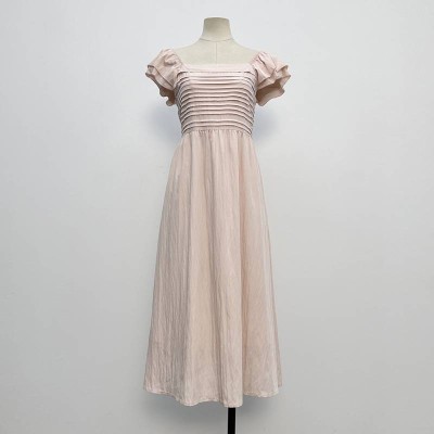 Light Pink Square Neck Pleated Ruffle Sleeve Waist Midi Dress