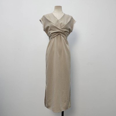 Minimalist V-neck Twist Sleeveless Midi Dress Beige Elegant Commute Dress