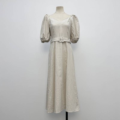Light Beige V-neck Puff Sleeve Waisted Midi Dress