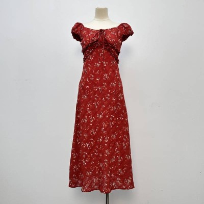 French Red Floral Square Neck Puff Sleeve Midi Dress Slim Fit Temperament Dress