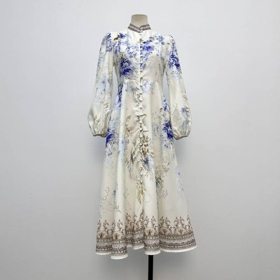 Vintage Stand Collar Blue Floral Print Long Sleeve Midi Dress
