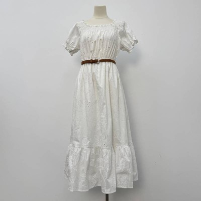 Square Neck Puff Sleeve Embroidered Waist-Tie White Midi Dress With Belt