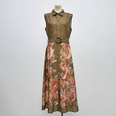 Vintage Printed Sleeveless Lapel Waist-cinched Midi Shirt Dress