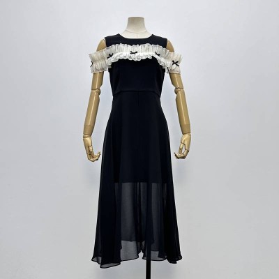 French Off-the-Shoulder Ruffle Bow Black Chiffon Midi Dress