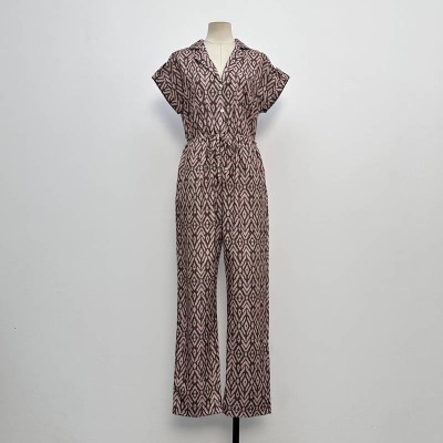 Vintage Geometric Pattern Lapel Drawstring Waist Jumpsuit Short Sleeve Casual One-Piece Pants