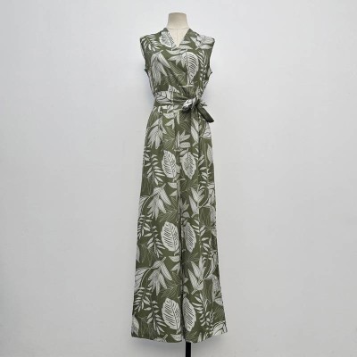 Vintage Leaf Print Sleeveless Waist-cinched Wide-leg Jumpsuit