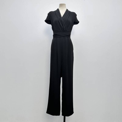 Black V-neck Short Sleeve Waist-cinched Wide-leg Jumpsuit Elegant Commuter Slim One-piece Pants
