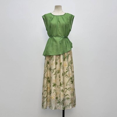 Elegant Green Sleeveless Waist-cinching Top + Printed Midi Skirt Two-piece Set