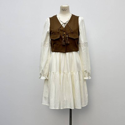 Vintage Tie-up Vest + Long Sleeve Dress Set French Gentle Style Two-Piece Outfit