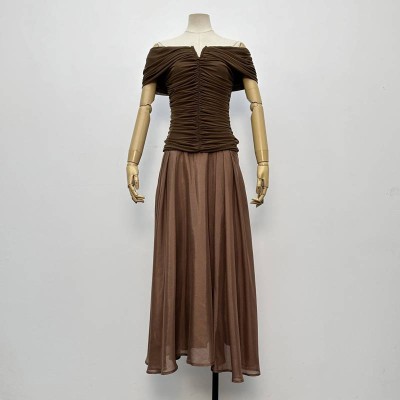 Vintage Brown Off-Shoulder Ruched Top + Mesh Midi Skirt Two-Piece Set