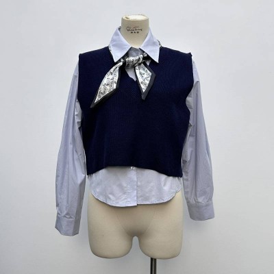 Preppy Style Long Sleeve Shirt + V-neck Knitted Vest Two-Piece Set With Scarf Commuting Layered Outfit