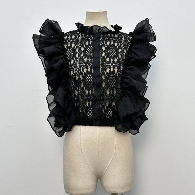 Black Lace Ruffle Sleeveless Cropped Top See-Through Design Niche Elegant Slimming Top