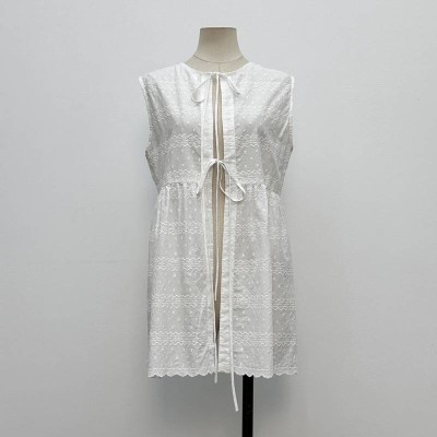 White Hollow Embroidered Tie-up Sleeveless Mid-length Outerwear Top