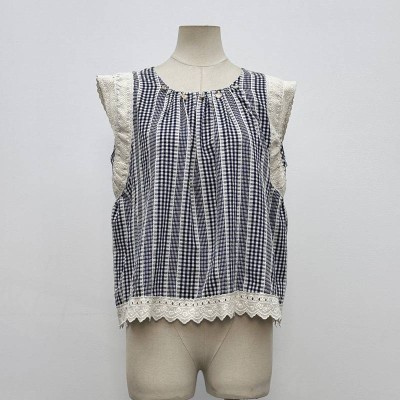 Vintage Gingham Sleeveless Ruffle Top Lace Trim Round Neck Loose Women's Blouse