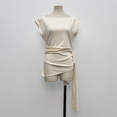 Elegant Boat Neck Sleeveless Waist Tie Top Solid Color Irregular Hem Top