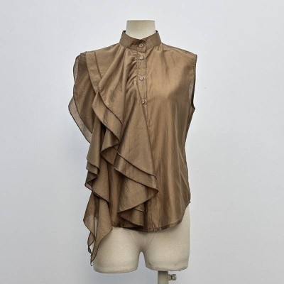 Elegant Stand Collar Ruffled Sleeveless Shirt Vintage Brown Unique Design Top