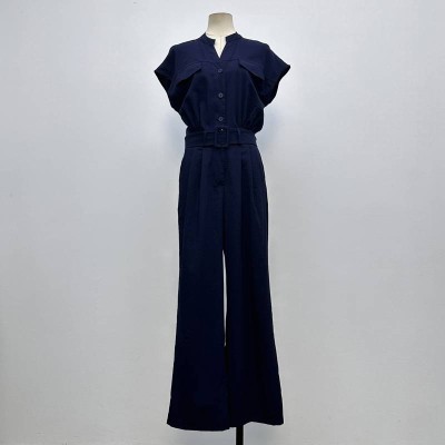 Navy Stand Collar Sleeveless Waist-Tie Wide-Leg Jumpsuit