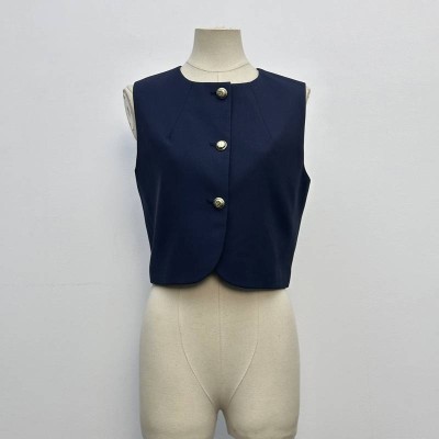 Navy Round Neck Sleeveless Cropped Buttoned Vest Top