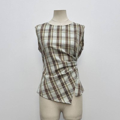 Vintage Plaid Waist-cinched Sleeveless Top Niche Design Irregular Hem Crew Neck Vest