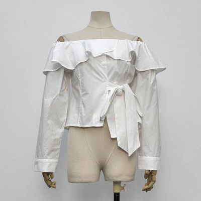 French Style White Off-the-shoulder Ruffle Long-sleeve Shirt Waist-tie Cropped Top
