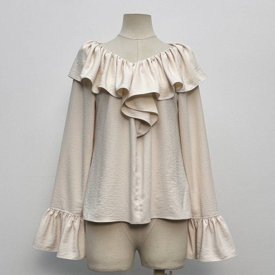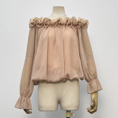 French Gentle Style Ruffled Off-the-Shoulder Long Sleeve Top Apricot Chic Blouse